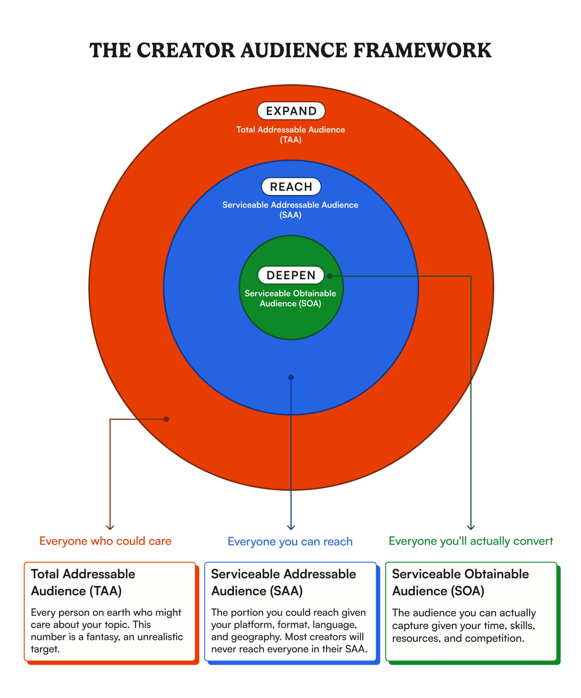 Total Addressable Audience (TAA): Everyone who could theoretically care about what you make. This is your ceiling if everything breaks right — every person on earth who might watch a niche video about sewing, or marketing, or language etymology. It’s a completely unrealistic ideal.